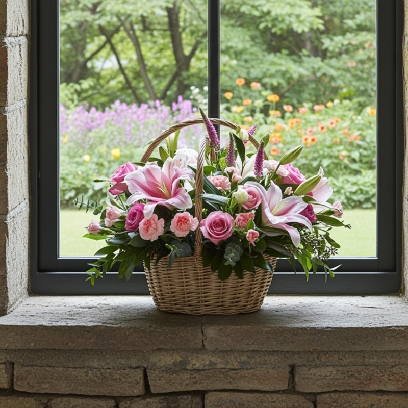 A classic basket is given a modern twist with groups of pink lilies, mauve roses, spray carnations and pink veronica. Flower basket included.