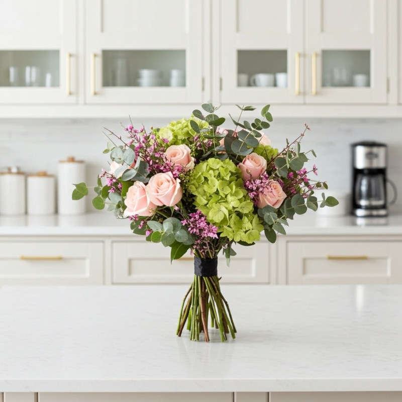 A beautiful hand tied bouquet of luxury pale pink roses, green hdyrangea and seasonal foliages.