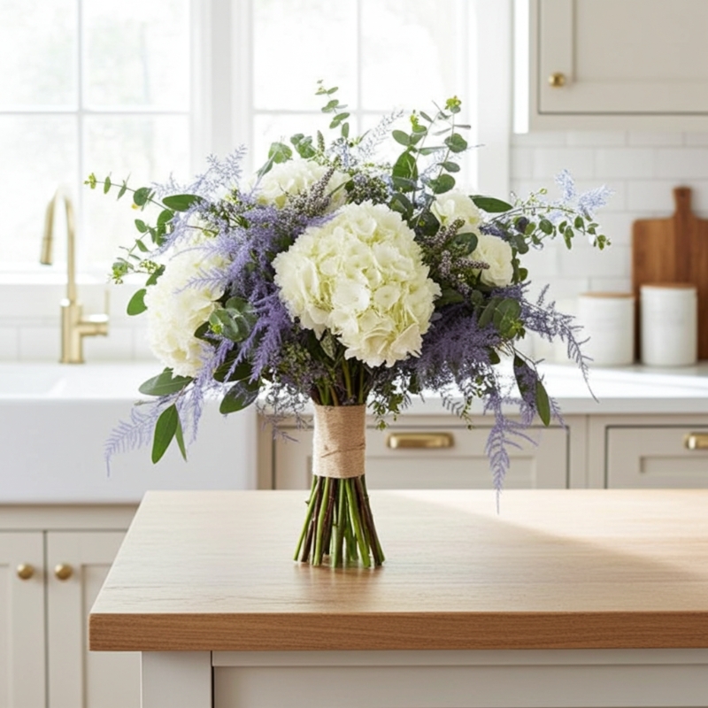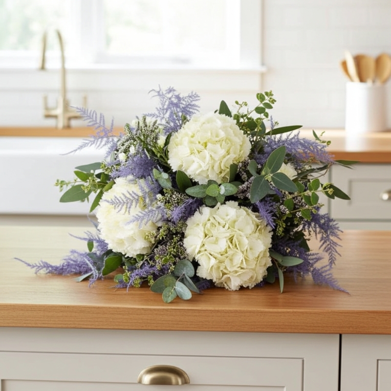 A beautiful hand tied bouquet of white hydrangea, veronica and coloured fern with seasonal foliages.