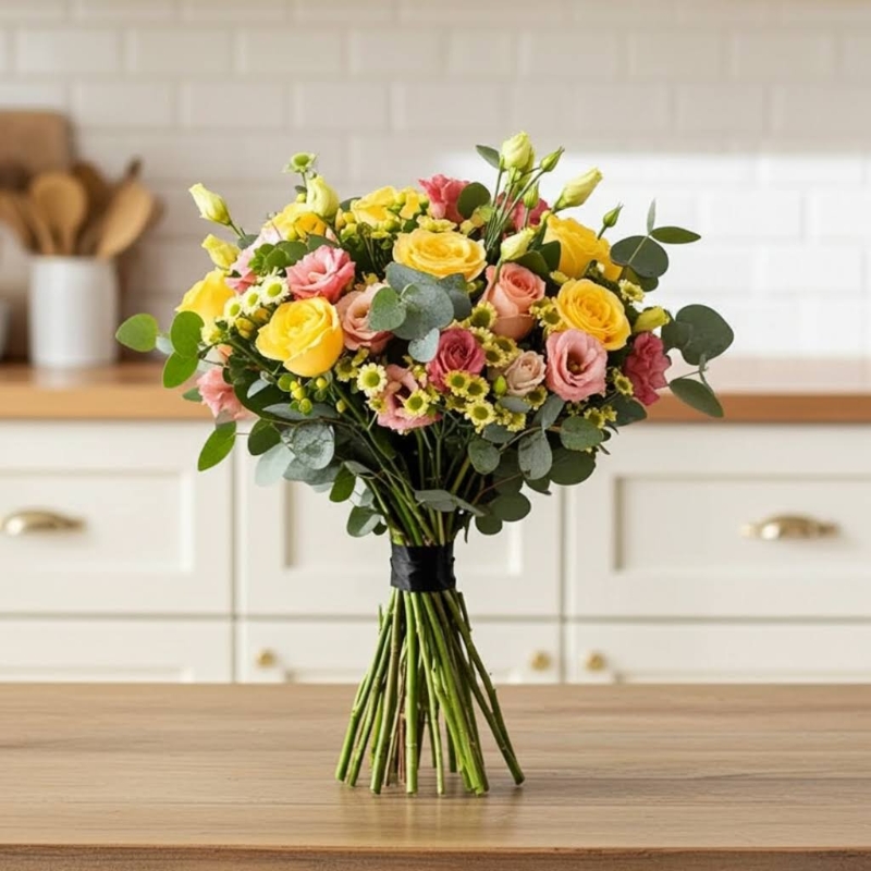 A beautiful hand tied bouquet of pink and yellow roses, yellow chrysanthemums, hypericum and lisianthus with seasonal foliages.