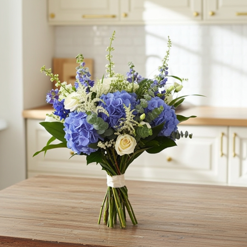 A beautiful hand tied bouquet of blue hydrangea, white roses, white lisianthus and blending foliage.