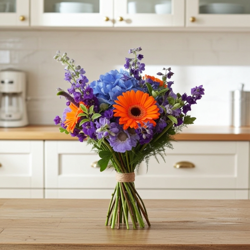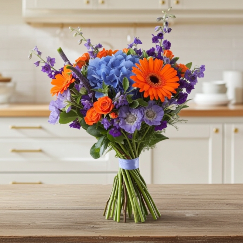 A beautiful hand tied bouquet of flowers in orange and blues, including blue hydrangea, orange gerbers and seasonal foliages.
