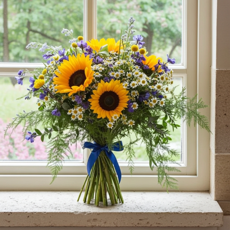 A beautiful hand tied bouquet of sunflowers, blue delphinium and tanacetum daisy.