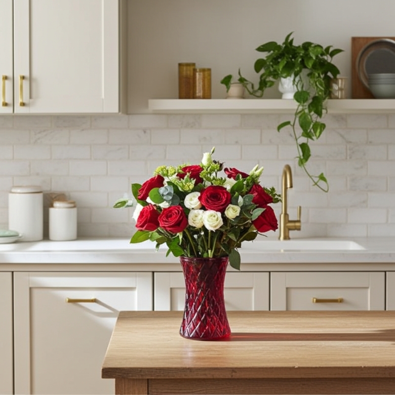 A romantic hand tied bouquet of 12 red roses and green lisianthus with seasonal foliages.
