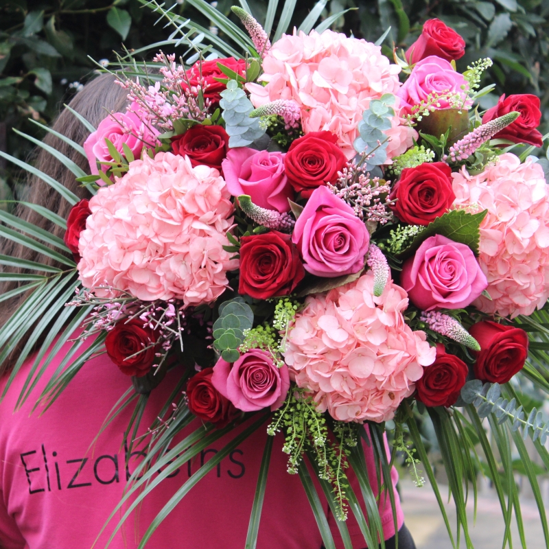 The showstopper, luxury red and pink bouquet of beautiful flowers. Including red roses, hydrangeas and veronica.