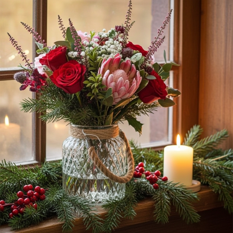 A luxury vase of festive flowers, including pale pink roses and protea with winter foliages.