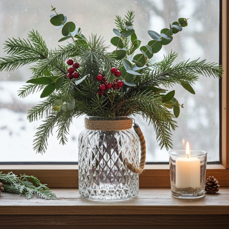 A vase of luxury christmas foliage and berries.