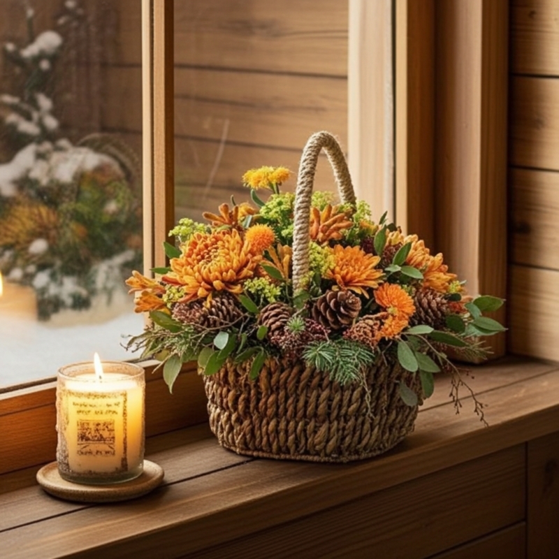 A festival of delight in this autumnal basket including large bloom Chrysanthum, Carthamus and pine cones.