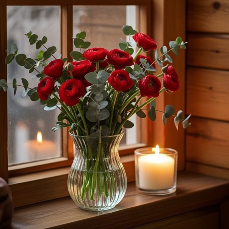 Red ranunculus and eucalyptus in luxury glass vase.