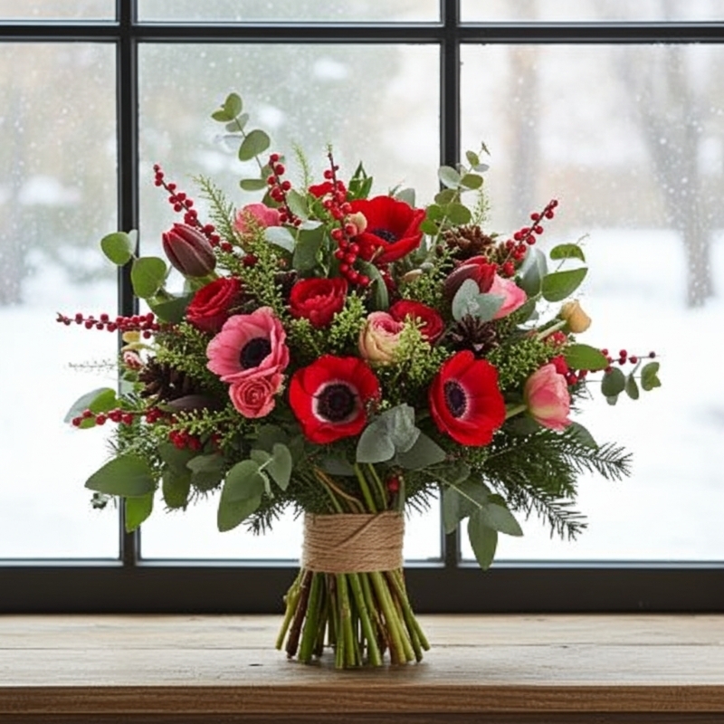 A woodland flower bouquet of red ilex berries, thlaspi bell and pine cones, Including red anemone and red tulips.