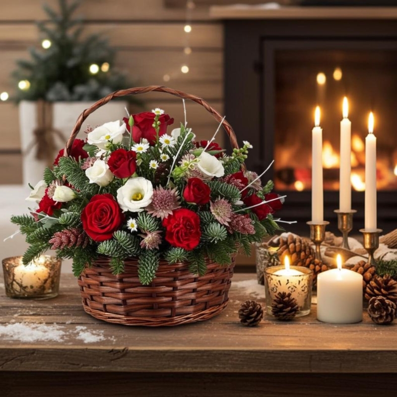 A beautiful basket of red roses, burgundy carnations, white lisianthus,  september and dusky pink astrantia amongst festive foliage. Finished perfectly with a touch of rose gold sparkle.