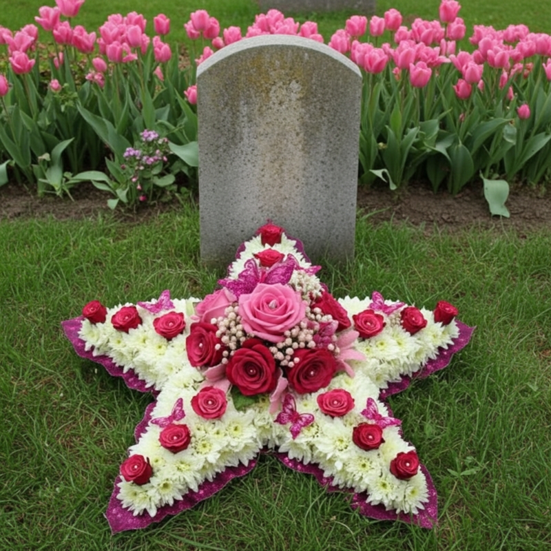 A 21" five pointed star tribute with roses on each point. Please call for further options.