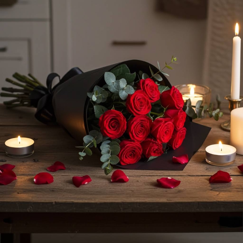 Simple and stylish, this bouquet of six Red Roses and complementary foliage will delight and impress.